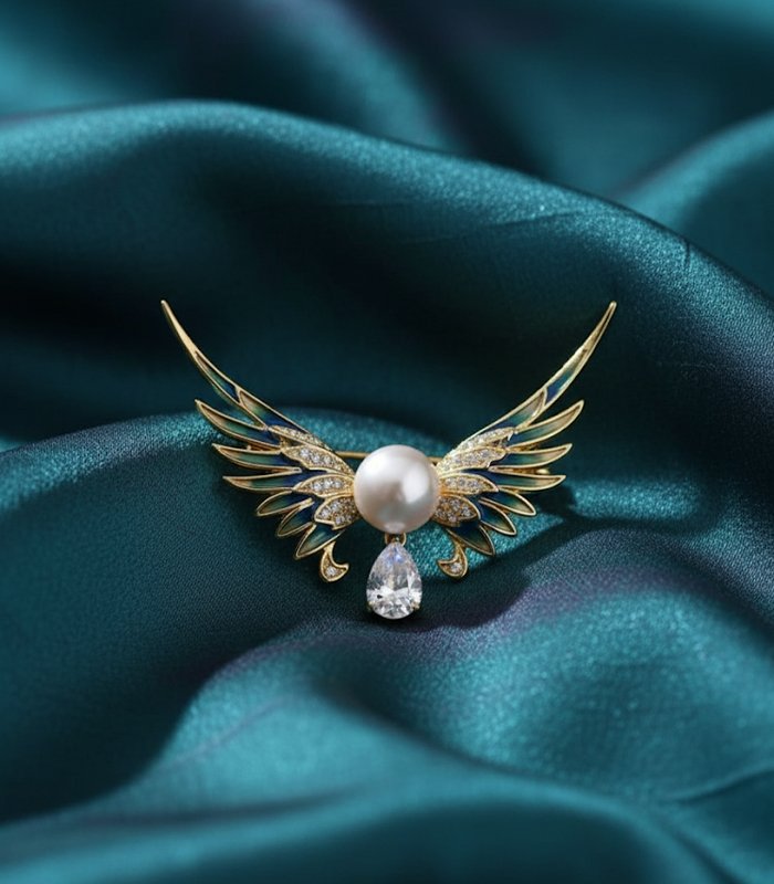 This ethereal and intricate brooch is designed in the form of sweeping wings, symbolizing freedom and grace. The feathers are beautifully rendered in gold-tone metal, featuring sections filled with a vibrant blend of deep teal and sapphire blue enamel that fades out towards the tips. The inner segments of the wings are meticulously embellished with tiny, sparkling pave-set crystals, adding a brilliant shimmer. At the center where the wings meet is a prominent, classic cream-colored simulated pearl. Dangling directly below the pearl is a large, faceted teardrop-cut cubic zirconia or crystal, which catches the light dramatically. Set against a rich, dark teal satin backdrop, this piece is a luxurious and symbolic accessory, perfect for adding an element of fantasy and sophistication to any ensemble.