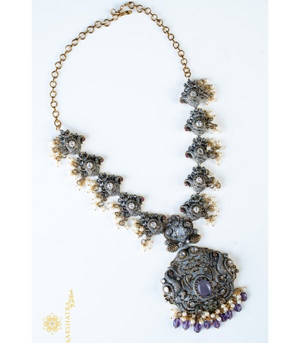 The Necklace features a flexible collar of repeated, ornate floral-style links, each set with a central clear crystal and surrounded by filigree detailing. The necklace culminates in a large, elaborate pendant centered on a prominent, faceted deep purple or amethyst-colored stone surrounded by clear crystals and a fringe of simulated pearls. The entire bottom edge is finished with delicate purple beaded drops.