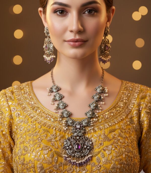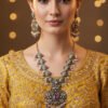 This grand jewelry set is inspired by traditional Indian designs, featuring an opulent arrangement of stones and detailed metalwork. Both the necklace and earrings are crafted in a dark, oxidized silver or gunmetal-tone finish, which enhances the brilliance of the stones and gives the set a rich, vintage look.