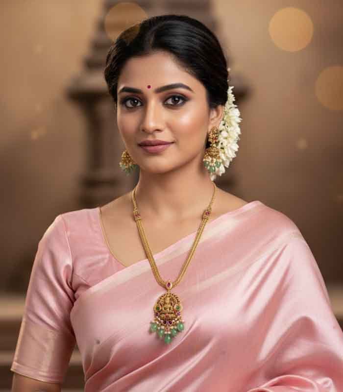 Adorn yourself with the divine grace of this breathtaking Temple Jewelry Necklace Set. This piece is the epitome of South Indian traditional artistry, centered around an intricately sculpted pendant likely depicting Goddess Laxmi, the giver of wealth and prosperity.