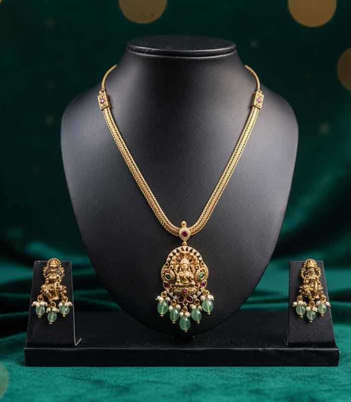 A spectacular traditional Temple Jewelry set featuring a detailed pendant of the Goddess Laxmi (or a similar deity). Crafted in an antique gold-tone with vibrant ruby, emerald, and mint-green bead accents.