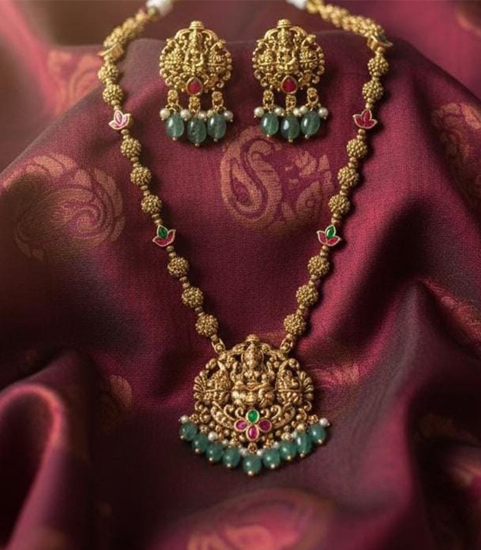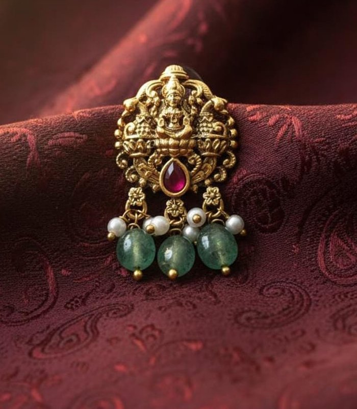 Below the deity motif, a single teardrop-shaped ruby or magenta-colored gemstone is set, adding a vibrant splash of color. The bottom edge is adorned with three dangling clusters, each comprising a small simulated pearl cap above a larger, translucent emerald-green polished bead or gemstone (possibly jade or green agate). The intricate craftsmanship and the rich combination of gold, deep red, and green make this an opulent and culturally significant piece, traditionally worn for weddings or festive occasions. It is displayed on a rich, patterned burgundy fabric, highlighting its traditional luxury.