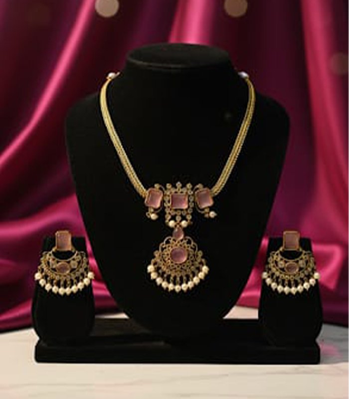 Adorn yourself with the striking Antique Gold-Tone Geometric Necklace Set. This opulent set features a choker-style necklace crafted with a textured, multi-strand chain in a rich antique gold-tone finish. The necklace showcases a focal arrangement of three small, square-cut simulated pink stones suspended along the bottom. The main attraction is a large, circular pendant hanging beneath the squares, set with a matching pink center stone and framed by intricate metalwork, finished with delicate pearl bead drops.