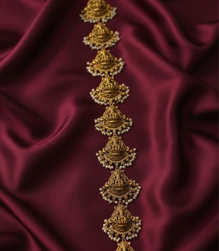The exquisite craftsmanship is further enhanced by delicate clusters of tiny pearl beads that dangle from the bottom edge of each motif, adding movement and traditional grace. This versatile piece of Kemp or temple jewelry can be styled in multiple ways—as a traditional Vaddanam (hip belt) accessory, a decorative hair embellishment (Jadai Billa or hair braid adornment), or even linked together to form a substantial statement necklace or Vanki (armband).