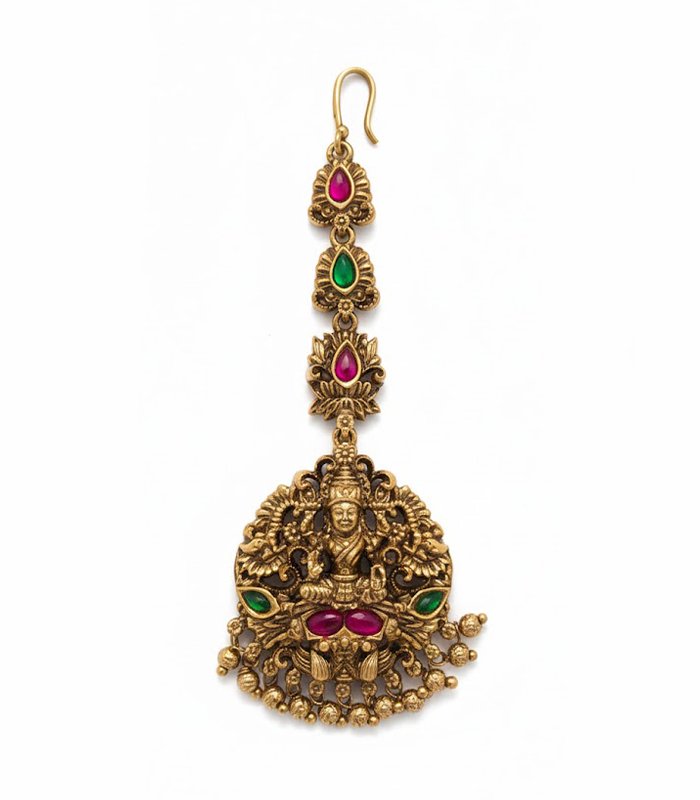 Adorn yourself with the grandeur of the Antique Gold-Tone Maang Tikka with Kundan and Temple Artistry. This majestic piece, finished in a rich antique gold tone, showcases a magnificent circular pendant depicting a seated deity (likely Goddess Lakshmi) surrounded by intricate temple and floral carvings. The design is brilliantly highlighted by large, teardrop-shaped simulated ruby (pink/red) and emerald (green) cabochon stones.