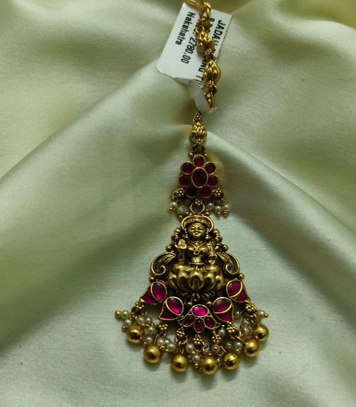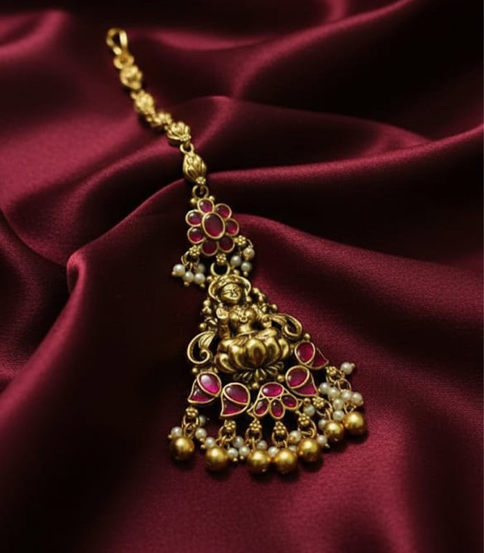 Perfect for adorning a bridal ensemble, complementing classical dance attire, or celebrating major festivals, this Maang Tikka embodies the exquisite craftsmanship and cultural significance of traditional South Indian temple jewelry.
