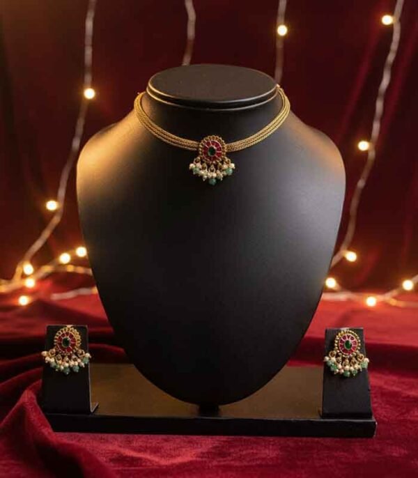 Exquisite Design: The necklace features a finely woven choker chain in a rich antique gold-tone finish that sits gracefully at the base of the neck. The central pendant is a beautiful circular motif, highlighting a vibrant ruby-red stone surrounded by sparkling emerald-green accents. The finishing touch is the delicate cluster of pearls and pale mint-green beads that dangle below, adding movement and an ethereal quality.