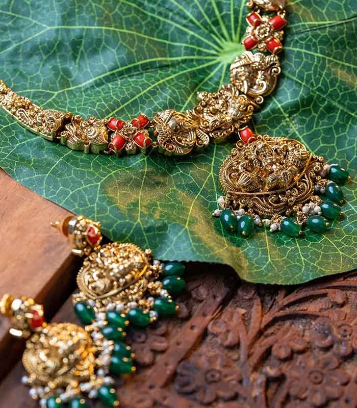 The Complete Ensemble: The matching large drop earrings are substantial and intricate, mirroring the main pendant’s design with the central deity figure and the lush green and pearl drops. This set is designed to be the focal point of a traditional ensemble, pairing flawlessly with Kanjivaram silk sarees and heavy bridal attire.