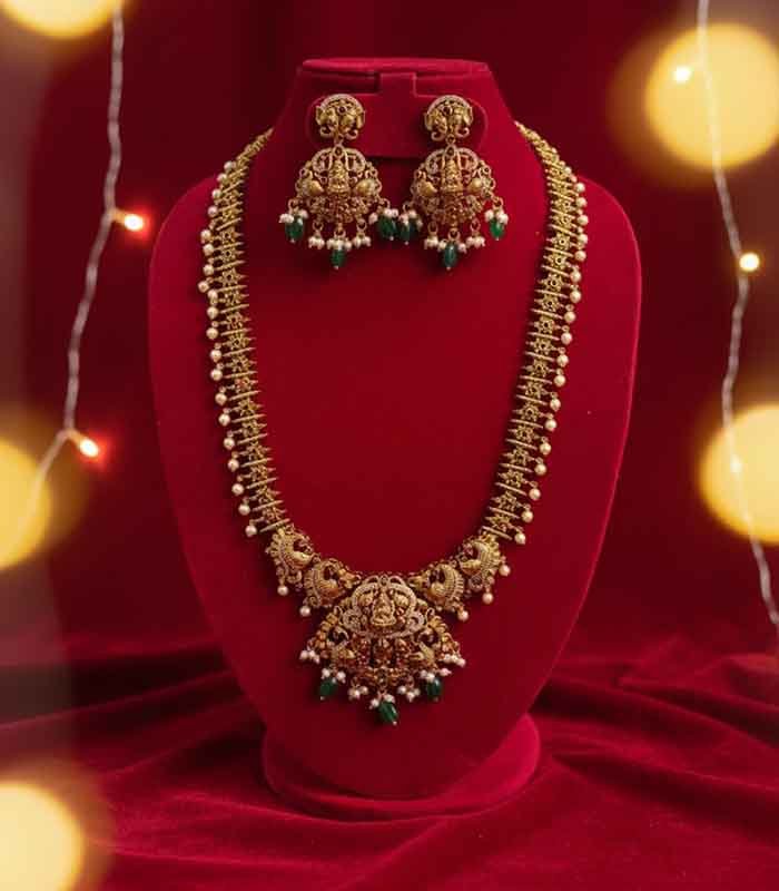 The Complete Ensemble: The matching statement stud earrings are substantial and intricate, echoing the deity motif and the green bead/pearl drops of the pendant, creating a perfectly harmonious and majestic look. This set is essential for brides, wedding guests, or anyone attending a major festive occasion who desires true traditional grandeur.