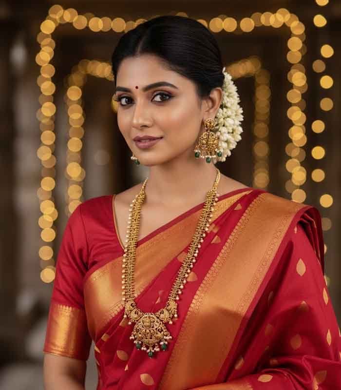 Intricate Temple Craftsmanship: The necklace features a striking central pendant showcasing the beautifully sculpted form of Goddess Lakshmi (or a similar deity), surrounded by traditional Peacock and floral motifs. The chain itself is a masterpiece, crafted with a continuous sequence of ornate panels, each detailed with tiny pearl drops that add a delicate, shimmering texture to the whole piece.