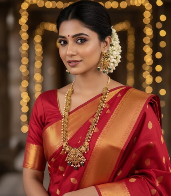 Adorn yourself with the blessing of Goddess Lakshmi and the timeless artistry of South India with this spectacular Antique Temple Jewelry Set. This medium-length necklace, or Haaram, is the perfect statement piece, designed to look and feel like a cherished family heirloom.