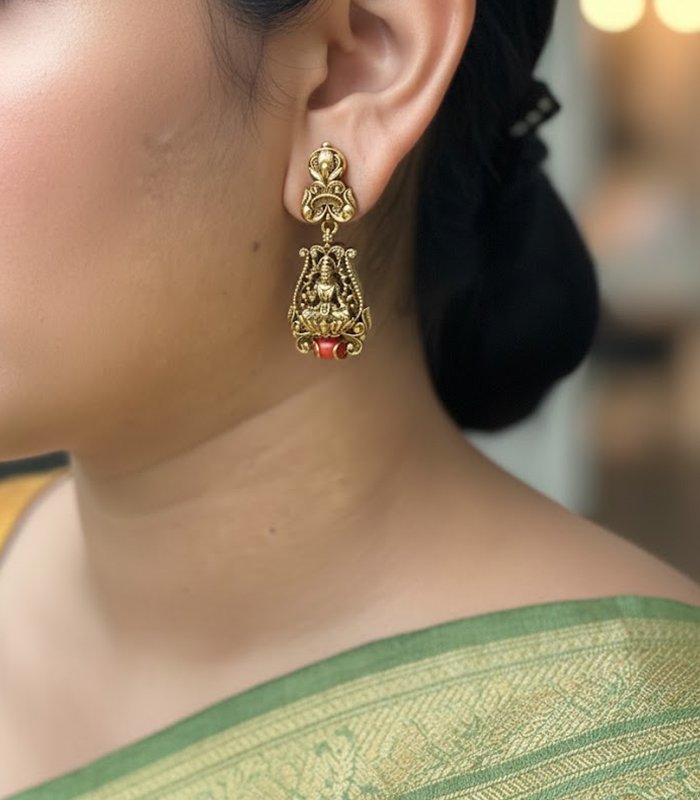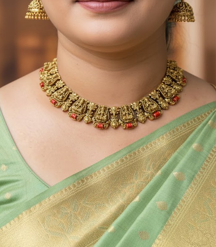 This antique Lakshmi temple choker necklace embodies timeless South Indian craftsmanship. Featuring intricately carved goddess motifs and vibrant red stone accents, it exudes divine elegance. The gold-plated finish and traditional design make it a perfect choice for weddings, festive wear, and cultural celebrations. Pair it with a silk saree for a truly regal look.