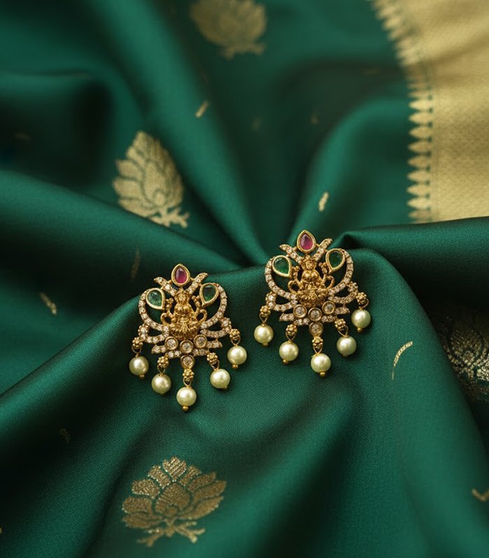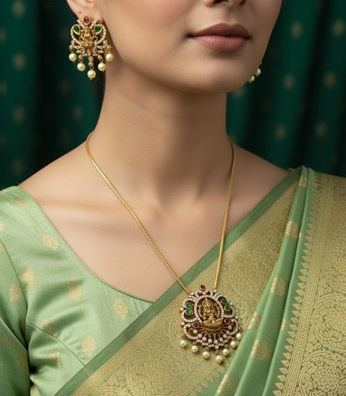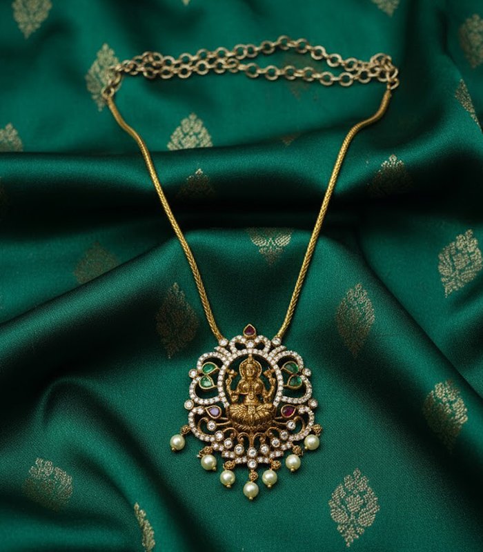 This exquisite antique Lakshmi temple necklace set showcases intricate craftsmanship with detailed deity motifs, shimmering stones, and lustrous pearl drops. The elegant combination of green and ruby stones adds a royal touch, making it a perfect choice for weddings, traditional celebrations, and festive occasions.
