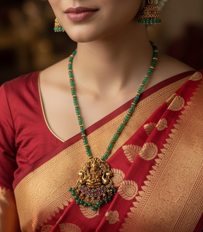 Antique gold temple necklace with Lakshmi pendant, green beads, and ruby accents — perfect for weddings and festive traditional looks.