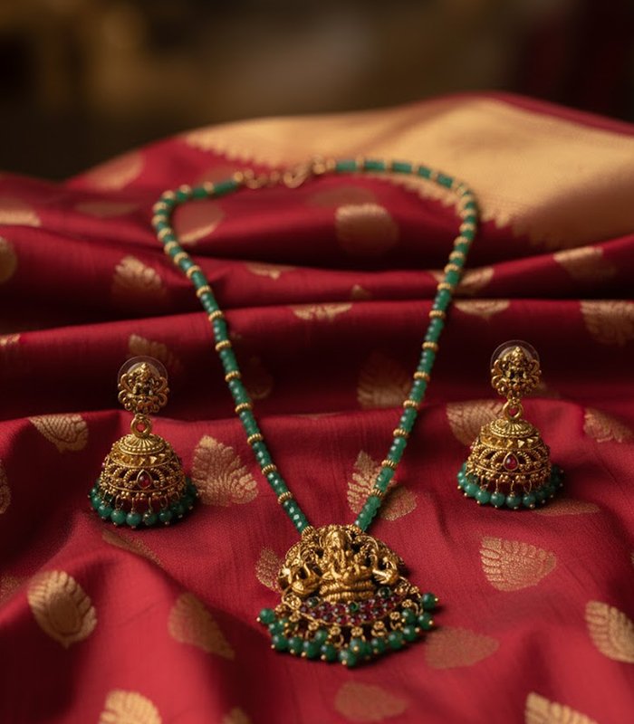 This stunning antique temple necklace features a divine Lakshmi pendant adorned with ruby, emerald, and pearl accents. The gold-plated finish paired with elegant green bead strands adds a regal charm, making it an ideal choice for weddings, festive occasions, and traditional attire. Handcrafted with intricate details, it reflects timeless South Indian heritage.