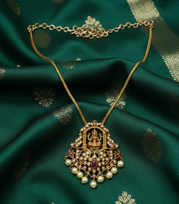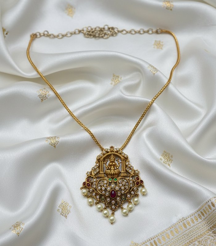 Antique Lakshmi temple necklace with pearl drops and stone work — a perfect blend of tradition, grace, and divine beauty for festive and bridal wear.