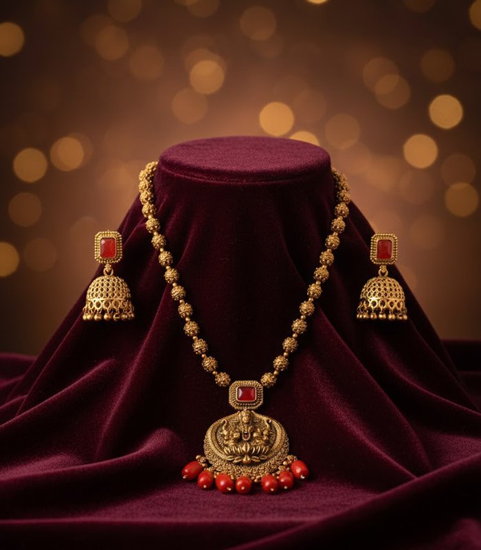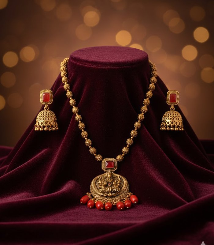 Antique temple necklace with Lakshmi pendant and red beads — a handcrafted masterpiece perfect for weddings, festivals, and bridal looks.