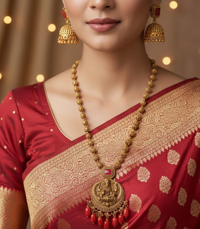 Elevate your traditional look with this exquisite antique Lakshmi temple necklace featuring a divine goddess motif. The intricately carved gold-plated pendant is enhanced with vibrant red beads and a rich temple-inspired chain. Perfect for brides and festive occasions, this handcrafted necklace adds a regal touch to silk sarees and traditional wear.