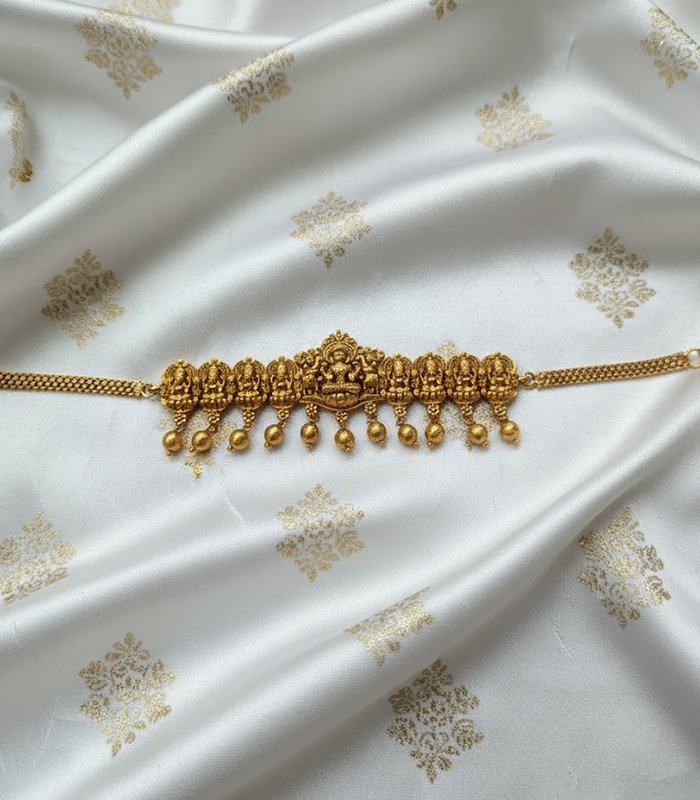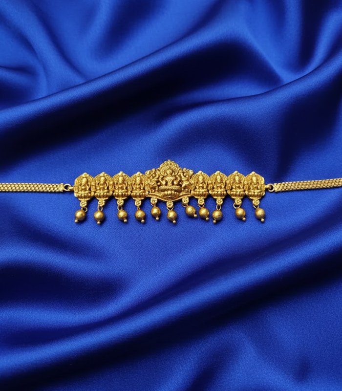 This antique Lakshmi temple vanki showcases intricate goddess carvings and traditional gold-plated detailing. Crafted with precision, it features small hanging gold beads that add movement and grace. Perfect for brides and festive occasions, this armlet embodies the charm of South Indian temple jewelry, enhancing any traditional outfit beautifully.