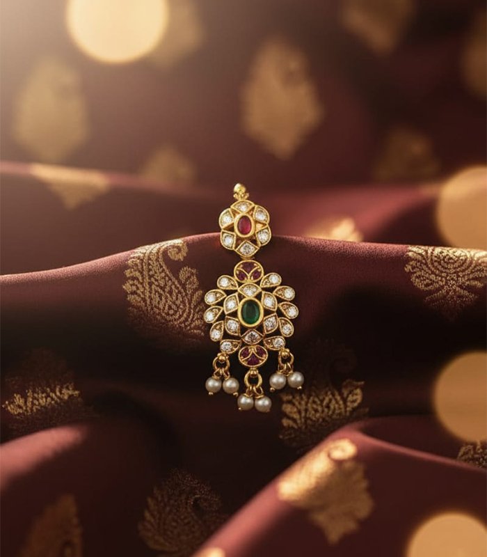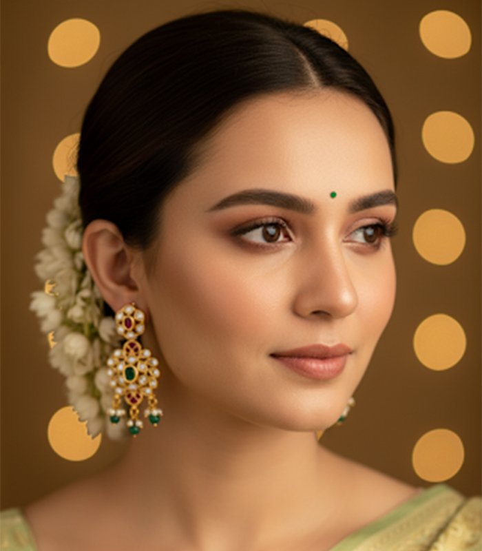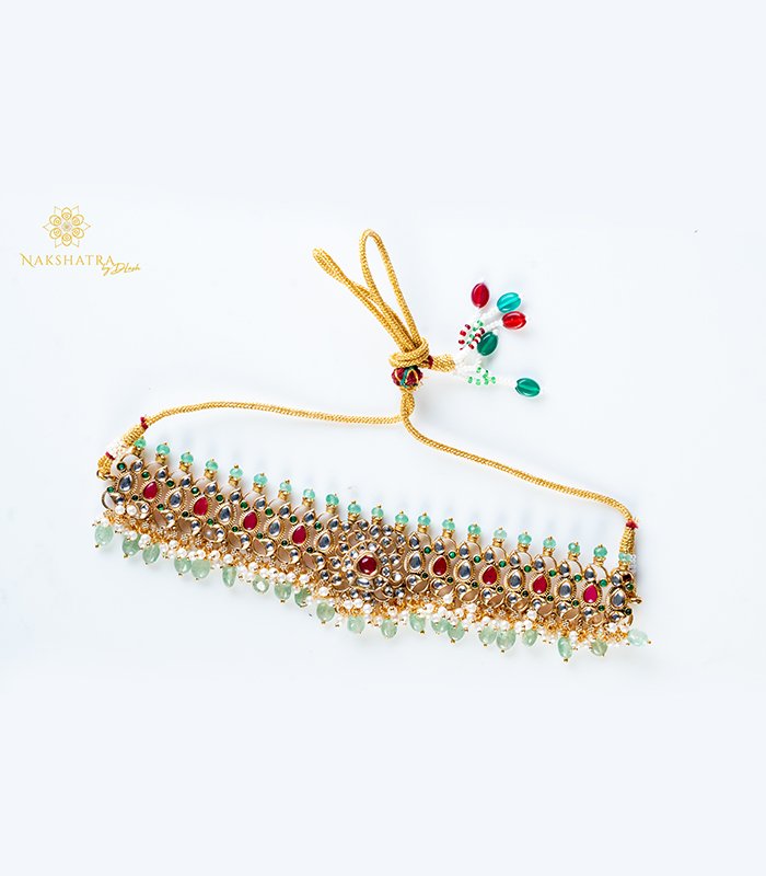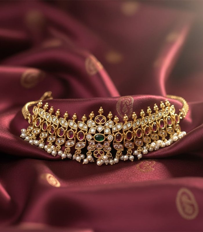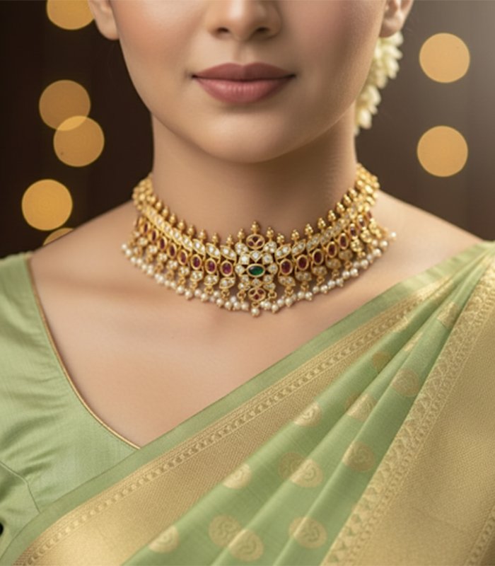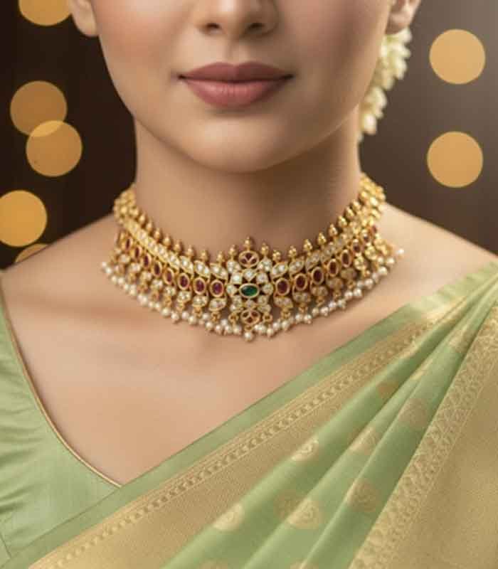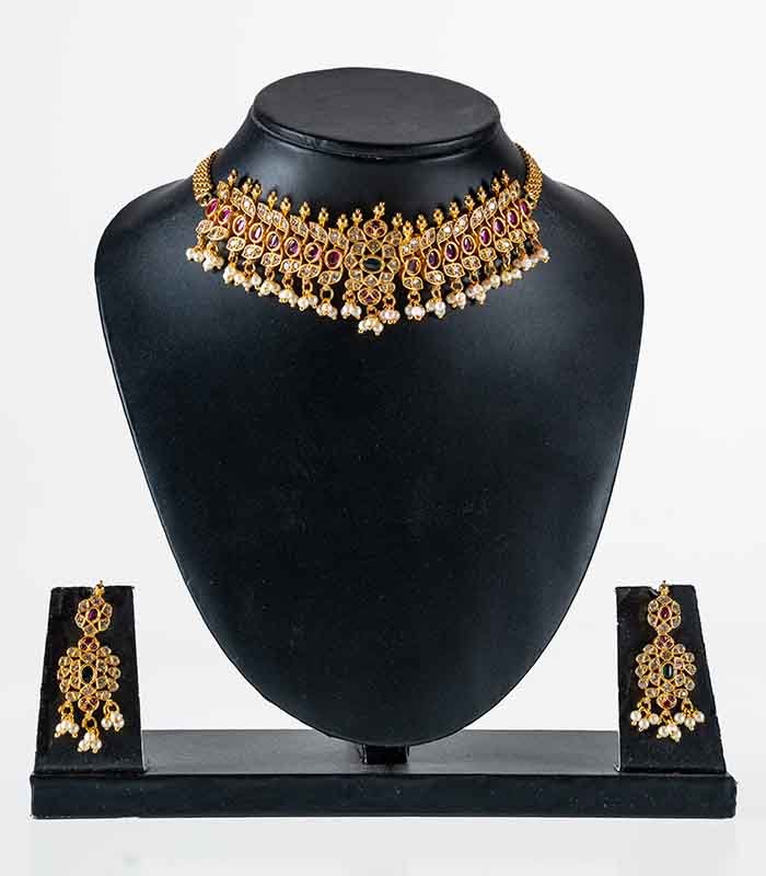 This exquisite traditional choker set is crafted in a gold-look finish, adorned with rich ruby-red and emerald-green stones, accented by sparkling white stones. The intricate floral and temple-inspired motifs are beautifully complemented by delicate pearl hangings, adding grace and elegance. Perfect for weddings, festive occasions, and cultural celebrations, this set comes with matching long earrings to complete the regal look.