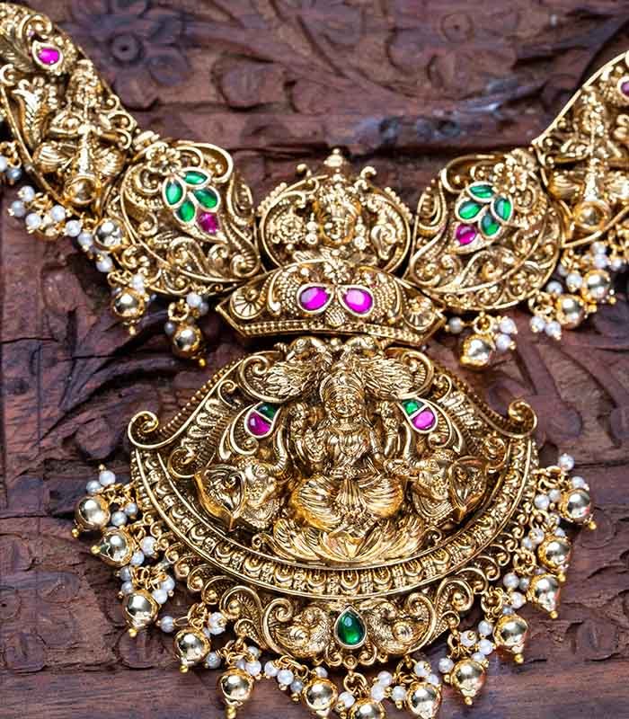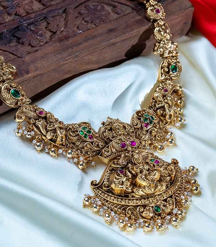Antique Temple Lakshmi Long and Short neckpiece with earrings. It gives an elegant real gold look and suitable for festive, bridal and other ethnic wear.