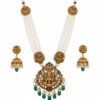 The chain is replaced by multiple strands of smooth, lustrous white pearls, connected by ornate antique gold-tone spacers and caps that also feature traditional deity motifs. This pearl detailing elevates the entire piece, making it feel both luxurious and contemporary.