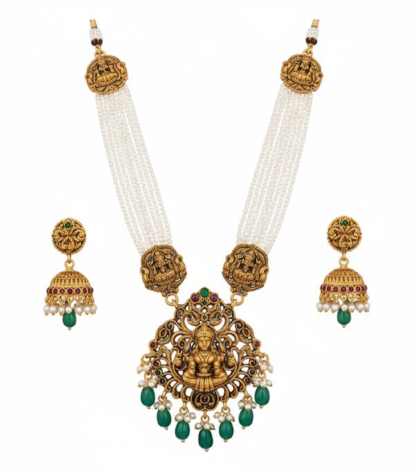 Design Highlights: The necklace is anchored by a magnificent, large Antique Gold-Tone pendant featuring a detailed, sculpted image of Goddess Lakshmi. The pendant is richly adorned with small ruby-red and emerald-green accents and finished with a cascade of striking dark green beads and delicate pearls that add depth and movement.