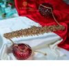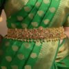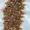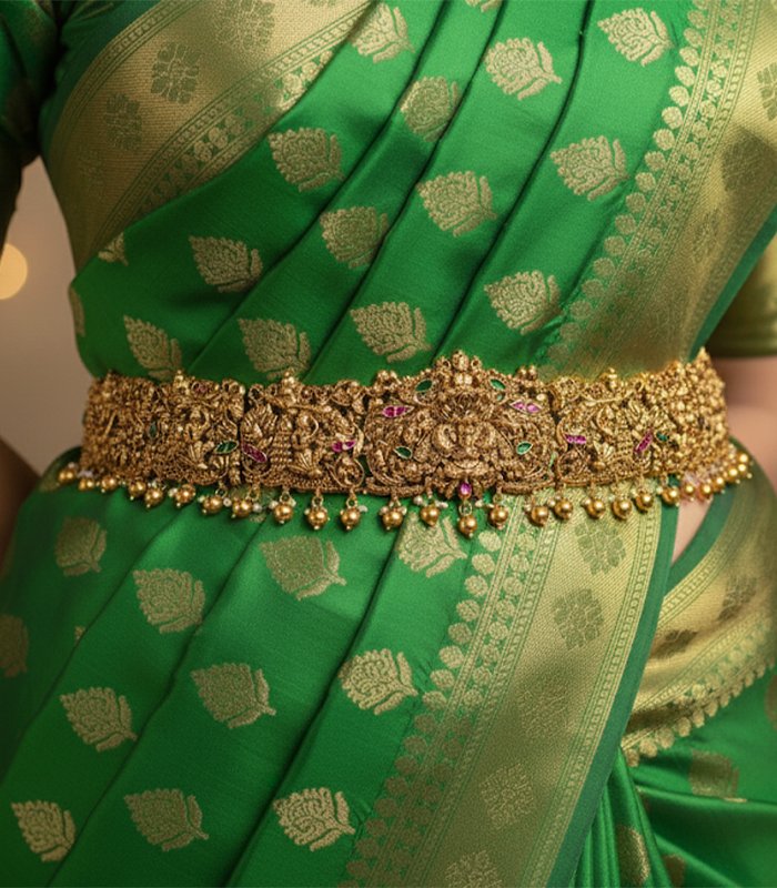This ornate waist belt features intricately carved depictions of Goddess Lakshmi and celestial figures, celebrating the richness of South Indian heritage. Accented with emerald green drops and ruby-hued stones, this piece adds grandeur to any bridal or classical attire.