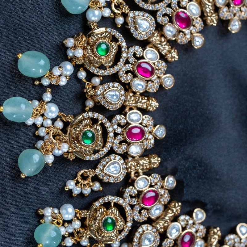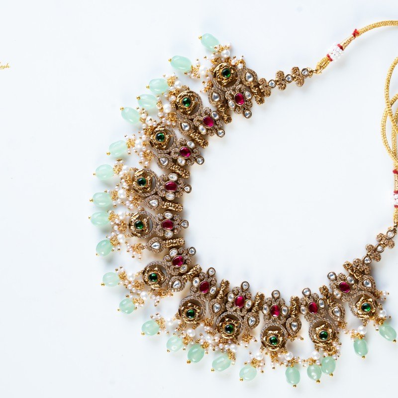 Exquisite Craftsmanship: The choker-style necklace features intricate metalwork, likely with a gold-tone finish, that beautifully frames an array of shimmering Kundan stones (or similar uncut gemstone style). Deep ruby-red and vibrant emerald-green accents add a royal pop of color, while the dangling clusters of pale mint-green beads and delicate pearls provide a soft, ethereal finish.