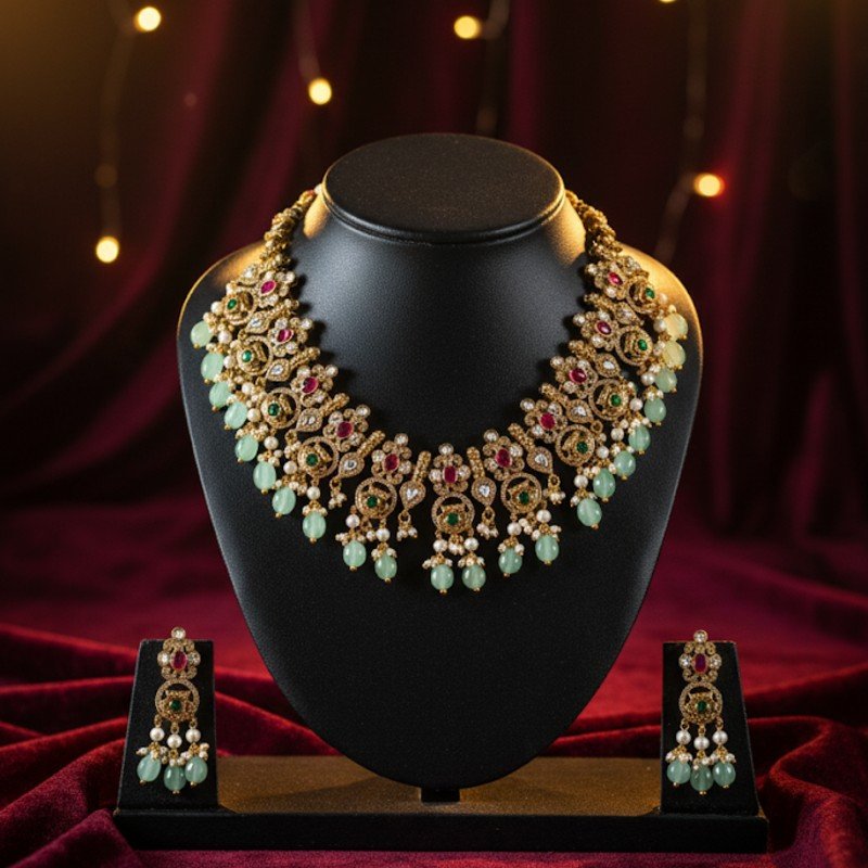 Elevate your look with this magnificent Antique Victorian-style necklace set. Drawing inspiration from the opulence of both British Victorian eras and classic Indian jewelry traditions, this piece is a true work of art.