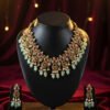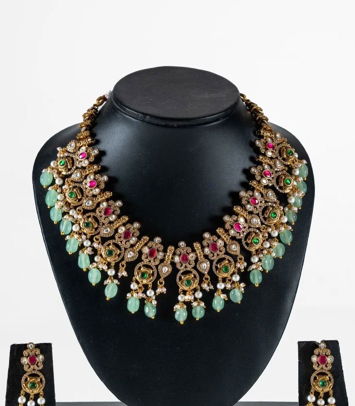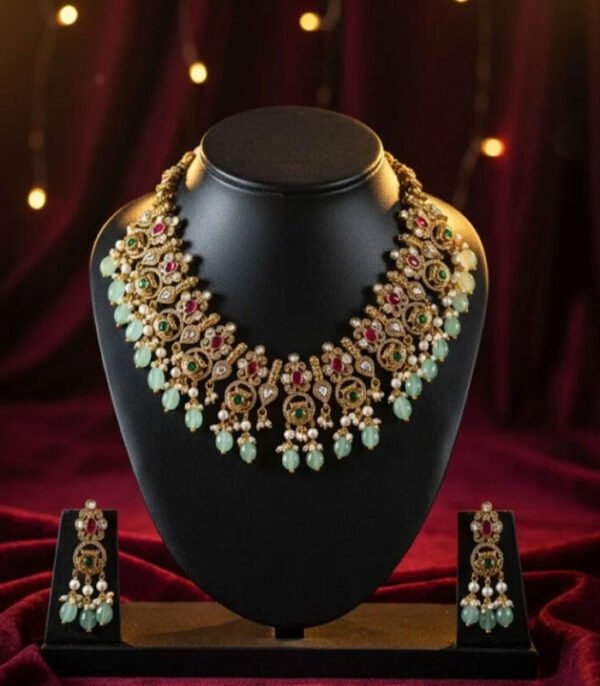 The Complete Set: The matching drop earrings perfectly echo the necklace’s design, creating a harmonious and lavish statement. Whether you’re attending a wedding, a major festival, or a grand reception, this set promises to turn heads and become a treasured heirloom.
