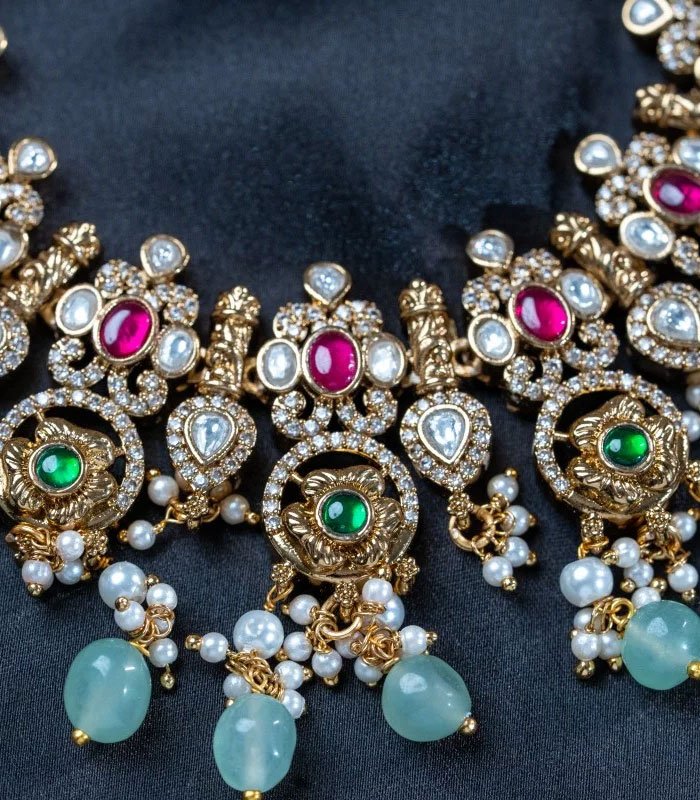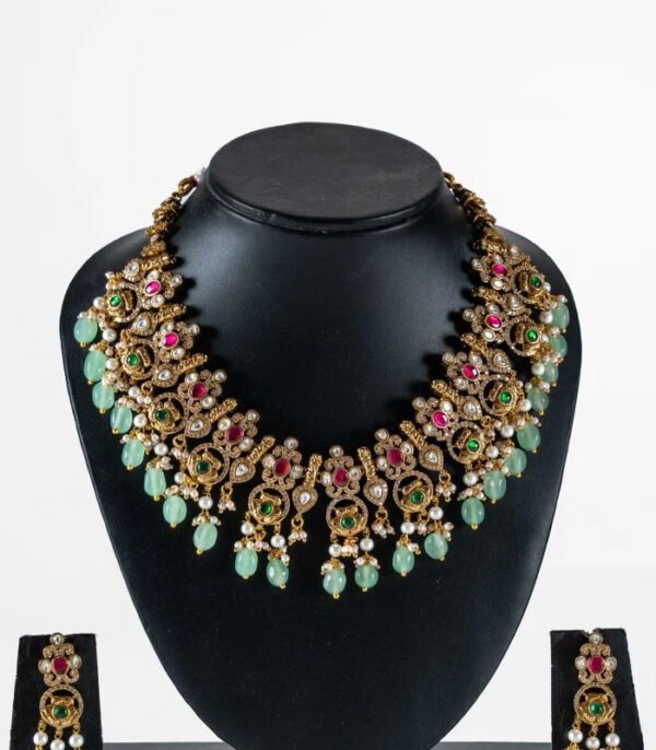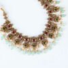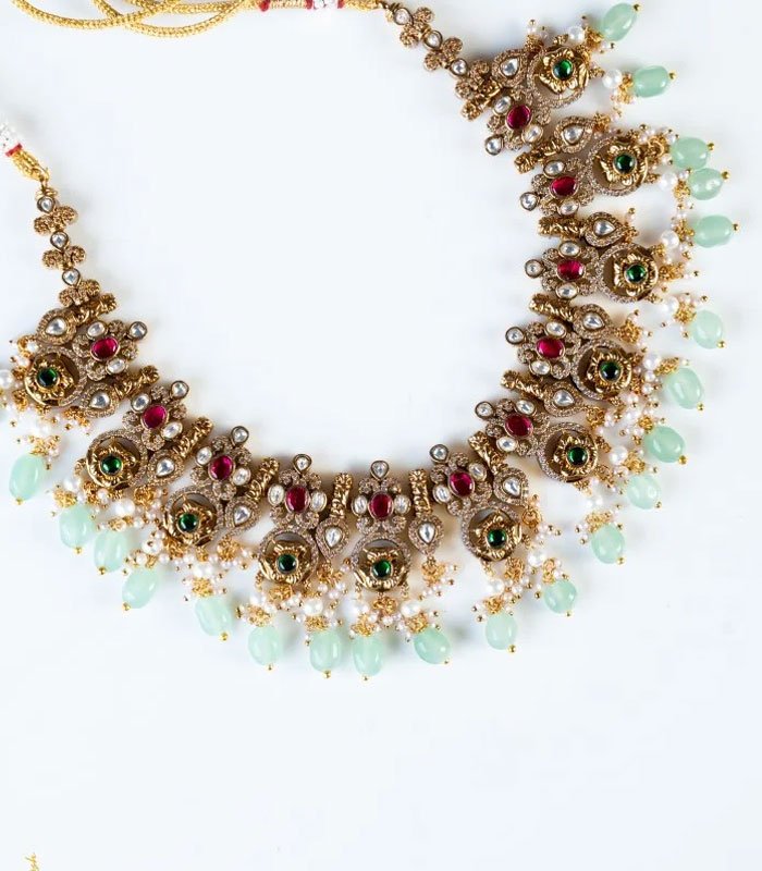 Exquisite Craftsmanship: The choker-style necklace features intricate metalwork, likely with a gold-tone finish, that beautifully frames an array of shimmering Kundan stones (or similar uncut gemstone style). Deep ruby-red and vibrant emerald-green accents add a royal pop of color, while the dangling clusters of pale mint-green beads and delicate pearls provide a soft, ethereal finish.