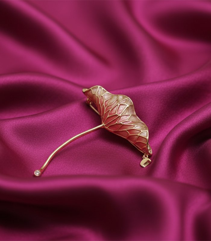 An artistic gold-tone brooch shaped like a curled leaf, featuring intricate cell-like patterns filled with shimmering pink and cream enamel, and accented with small, clear crystals.