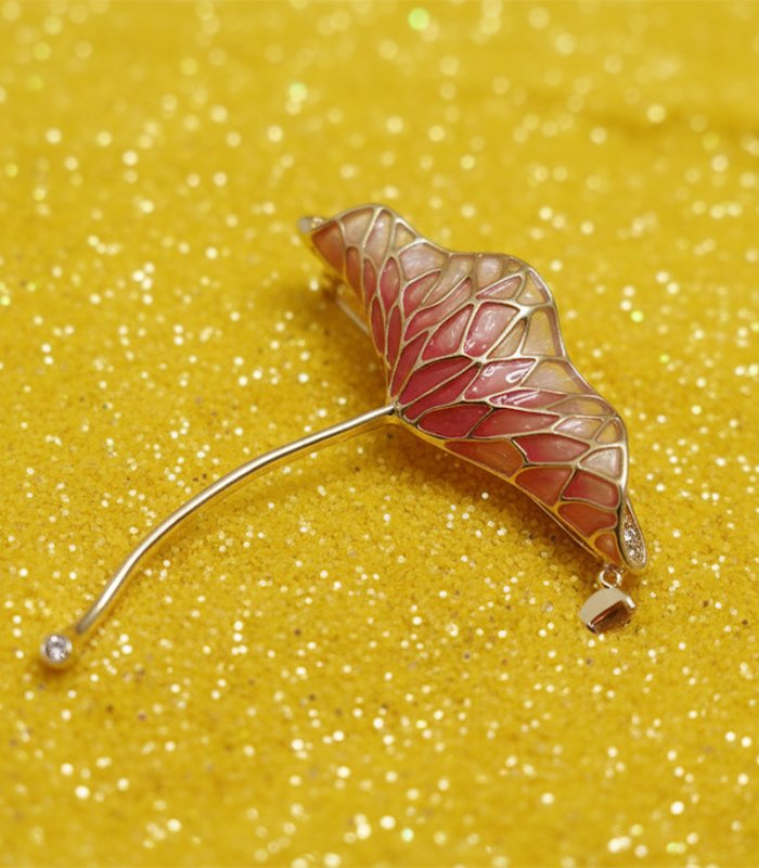 This unique and beautiful brooch captures the organic, flowing lines reminiscent of the Art Nouveau style. It is designed as a stylized, curled lotus or lily pad leaf, rendered in gold-tone metal. The surface of the leaf is segmented into a delicate, vein-like structure, with the spaces filled with a translucent, glassy enamel that transitions subtly from rich pinks at the center to soft creamy whites and yellows near the edges. This shading gives the piece a lovely, luminous depth.