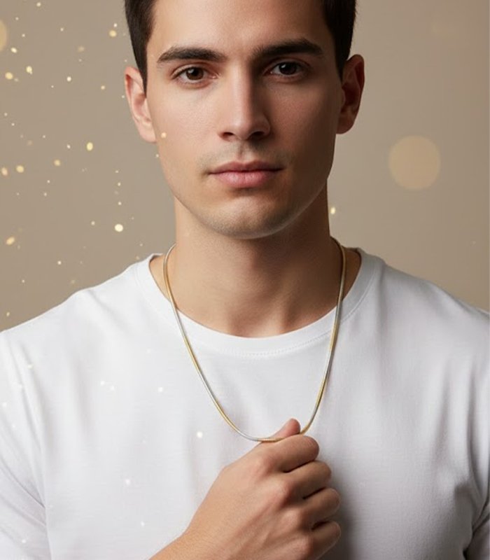 The chain is dramatically showcased on a lush, deep emerald green velvet backdrop, a rich color that accentuates the dual brilliance of the metal. The warm, soft background lighting enhances the chain’s subtle shine and premium feel. Secured with a secure clasp, this chain is an ideal choice for the fashion-forward individual who appreciates elegance and adaptability in their everyday wear.