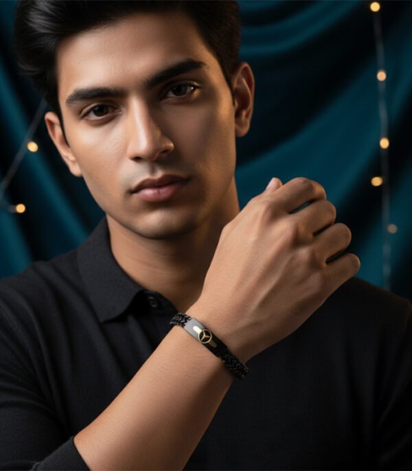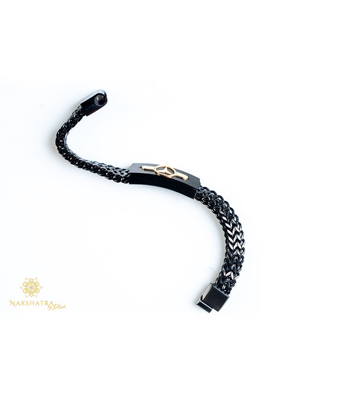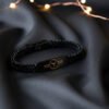This sophisticated men’s bracelet is the perfect statement piece for the modern individual who values luxury and meticulous design. The bracelet features a durable, black woven chain construction, providing a strong, tactile texture that is both comfortable for daily wear and resistant to wear and tear.