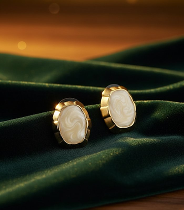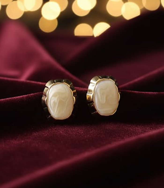 These timeless stud earrings exude a refined, vintage-inspired elegance. Each earring showcases a distinct oval cameo, carved from a white or cream-colored material (possibly shell, resin, or mother-of-pearl). The carving depicts a traditional classical profile, such as a woman’s face or mythological figure, rendered in low relief.