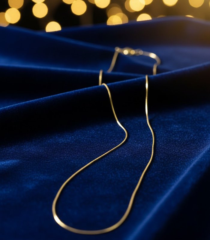 Sleek, delicate gold snake chain draped over luxurious royal blue velvet. Perfect for pendants or a minimalist, elegant look.