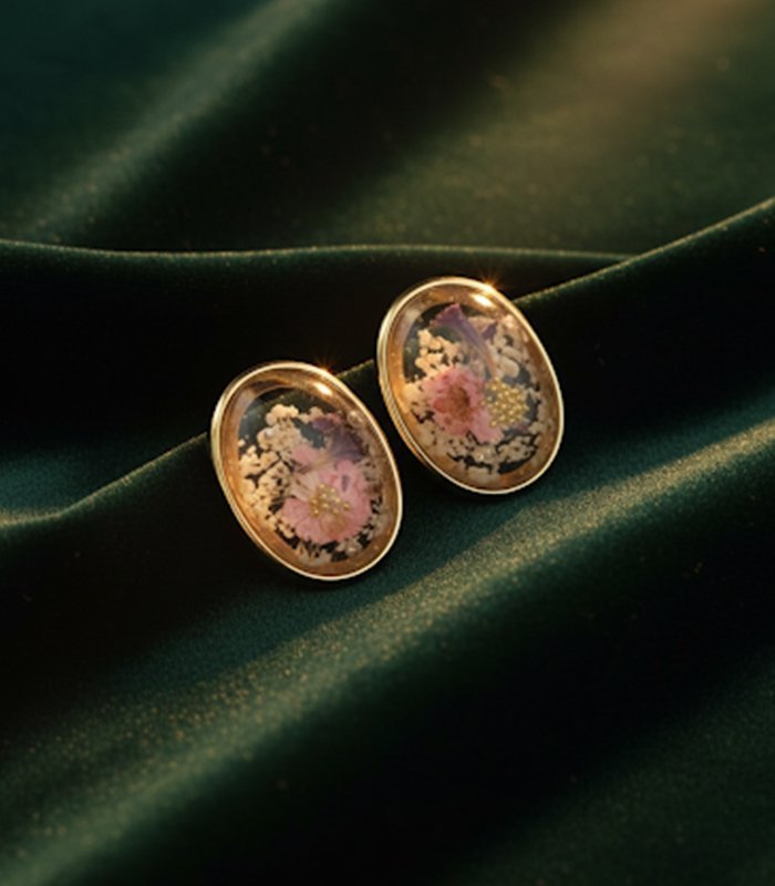 These enchanting earrings offer a captivating way to wear nature’s beauty. Each piece is a gold-tone oval stud earring with a simple, polished bezel setting. The central element is a clear, domed resin inlay that encases a miniature arrangement of real, tiny dried flowers and possibly leaves.