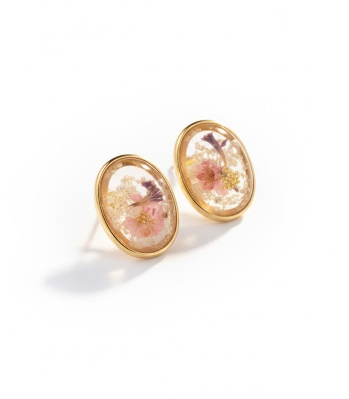 Unique gold-tone oval stud earrings featuring real pressed dried flowers and botanical elements suspended beautifully within a clear, crystal-like resin setting.