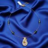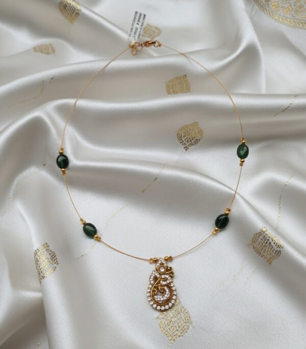 This elegant gold-plated necklace features a beautifully crafted pendant adorned with sparkling stones and pearls. The delicate chain is accented with green beads, adding a touch of sophistication. Perfect for festive wear, traditional functions, or elegant evening occasions.