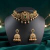 The Complete Ensemble: The set is perfectly complemented by a pair of stunning matching Jhumka (bell-shaped) earrings. These earrings echo the choker’s design, featuring emerald-green accents and a beautiful fringe of coordinating pearl drops, creating a harmonious and truly captivating ensemble.