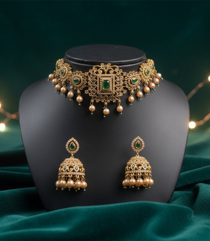 A breathtaking Polki-style choker set featuring a striking central emerald, intricate antique gold-tone work, and a cascade of lustrous pearls. Paired with elegant matching Jhumka earrings.