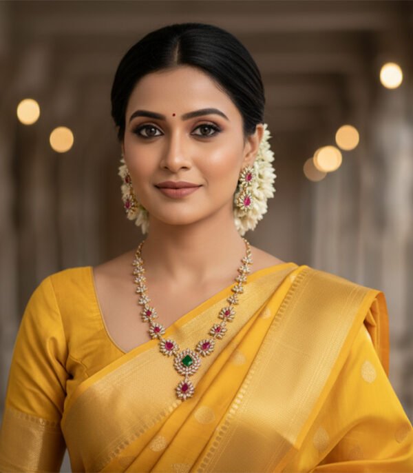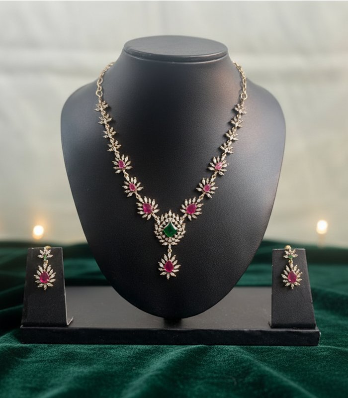 Whether paired with silk sarees, designer lehengas, or elegant gowns, this necklace set adds a royal glow to every outfit. It also makes a meaningful gift for weddings, anniversaries, and special milestones. The Emerald Radiance Blossom Necklace Set is not just jewelry—it is a statement of grace, confidence, and unforgettable beauty.