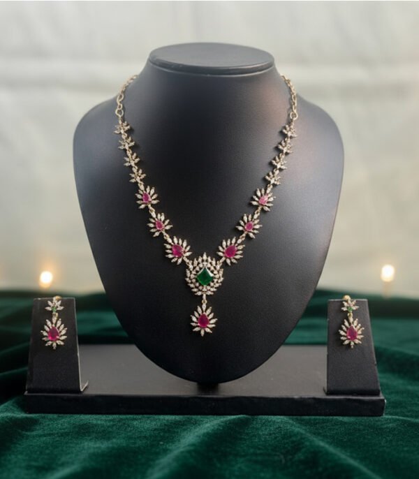 The Emerald Radiance Blossom Necklace Set is a breathtaking celebration of luxury, elegance, and timeless beauty. Designed with delicate floral-inspired motifs, this stunning necklace is highlighted with sparkling stones, rich pink accents, and a striking emerald-green centerpiece that draws instant attention. The graceful arrangement of shimmering elements creates a radiant flow along the neckline, making it perfect for grand occasions.