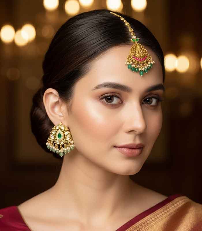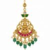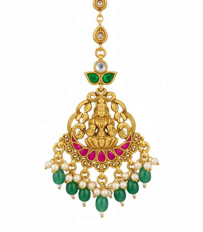 A traditional gold-plated Maang Tikka featuring the goddess Lakshmi seated on a lotus, accented with green and pink stones, and embellished with green beaded drops and small pearls.