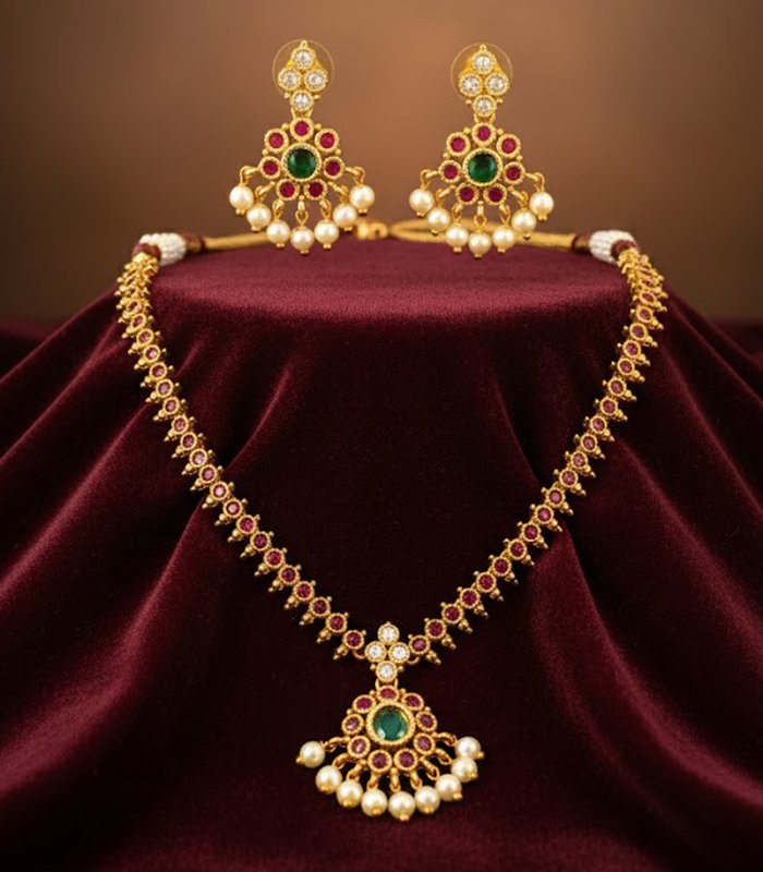 Radiate traditional charm with this exquisite gold-plated necklace set adorned with vibrant ruby and emerald stones. The intricate design is enhanced by lustrous pearl drops, adding elegance and sophistication. Perfect for weddings, festive occasions, and cultural celebrations, this timeless jewelry set complements sarees and ethnic attire beautifully.