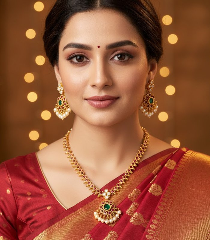 Gold-plated ruby and emerald necklace set with pearl drops. A perfect blend of tradition and elegance for weddings and festive occasions.