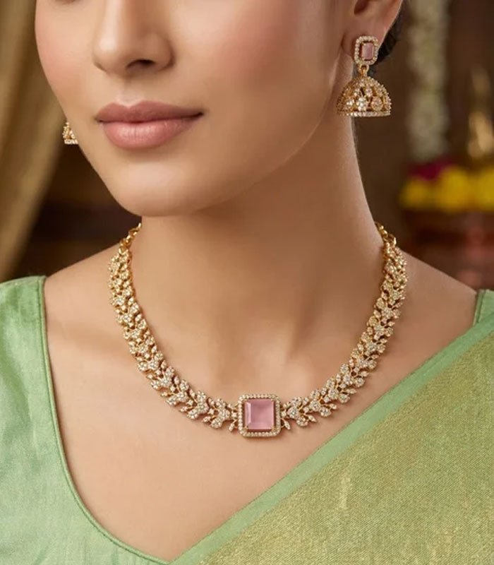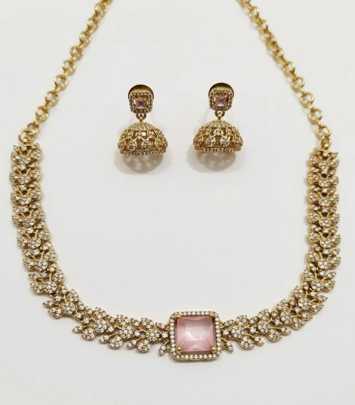 Adorn yourself with the exquisite Gold-Tone Floral Pave Necklace and Jhumka Earring Set. This striking contemporary set features a choker-style necklace crafted in a bright gold-tone finish. The necklace boasts a continuous pattern of stylized floral or leaf motifs, each entirely paved with brilliant simulated diamonds (or cubic zirconia), creating a rich, dazzling texture. The centerpiece is a prominent square-cut simulated pink gemstone, framed by the sparkling pave work, lending a soft, feminine contrast.
