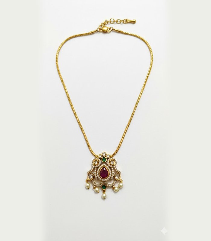 A traditional gold-tone necklace featuring a ruby teardrop center stone, surrounded by clear/colored Kundan-style stones, micro-pave, and pearl drops.